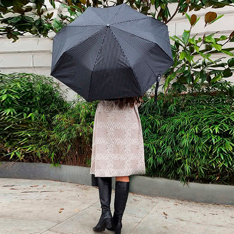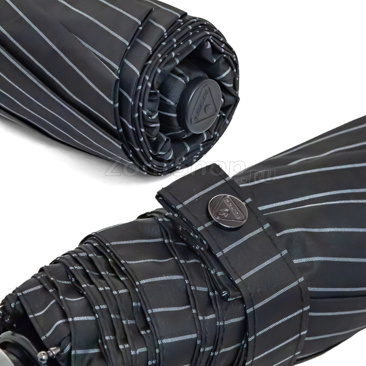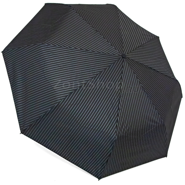 Зонт для мужчин в 3-сложения черного цвета в серую продольную полоску от компании Fulton доставит своему обладателю удовольствие в пользовании. В сложенном виде зонтик стандартной длины и среднего веса, поэтому его можно брать с собой ежедневно.