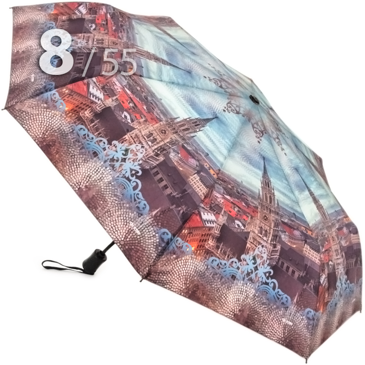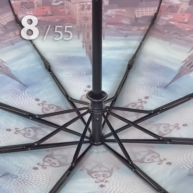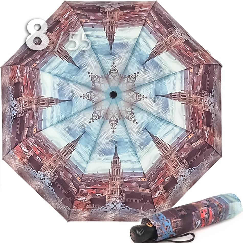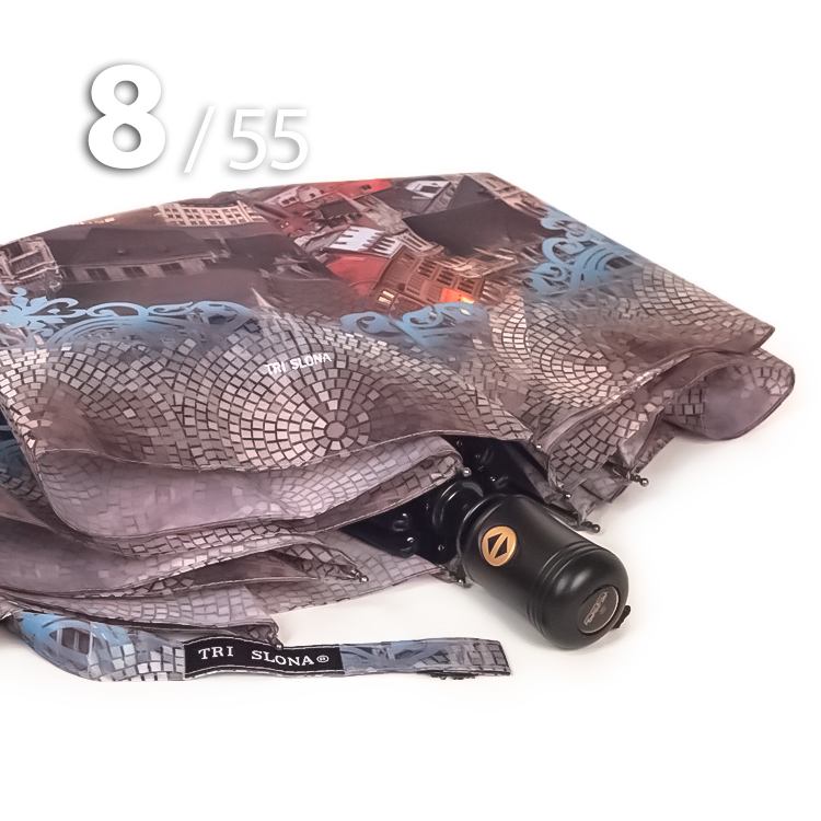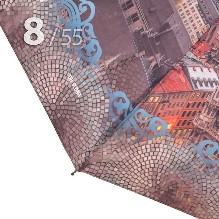 Облегченный складной зонт для женщин от компании Три СлонаЖенский зонт голубого цвета в 3-сложения с видом старой Праги на куполе представляет компания Три Слона. Преимуществом данной модели являются средний размер в сложенном виде и облегченный вес, что очень удобно для небольших сумок, рюкзаков, т.к. не займет много места.Полный Автомат - гарантирует легкое и комфортное управление, поскольку нажатием всего одной кнопки зонт можно открыть или закрыть. При полном сложении зонта, купол фиксирует специальный хлястик на липучке.Ткань купола - полиэстер с пропиткой, которая успешно противостоит воздействию воды, пыли и грязи. А специальное тефлоновое покрытие усиливает водоотталкивающие свойства материала и защищает зонт от вредного воздействия окружающей среды.Тип переплетения нитей «эпонж»- особая структура плетения, способная отталкивать воду. За счет неравномерного распределения нитей, образовываются узелки. Поверхность получается, как бы губчатой, на ней капли воды не задерживаются - стекают вниз и даже при сильном дожде зонтик не протечет и быстро высохнет после намокания.Ручка - выполнена из пластика. Дополнена ремешком-петелькой для фиксации зонта на запястье или для подвешивания.Каркас - на 8-ми спицах из высокопрочных материалов, обеспечивает долгий срок службы изделию.Чехол – стандартный идет в комплекте, для удобства переноски и хранения, в случае сильно мокрого зонта затруднит протекание и намокание сумки.Антиветер – защищает зонт от поломок. Пружинки в конструкции спиц не дают креплениям ломаться, позволяя им выворачиваться в обратную сторону и возвращаться на место. Но обращаем ваше внимание, что зонт не рекомендуется использовать при порывах ветра (особенно разнонаправленного), так как зонтик может сломаться. И случай не будет считаться гарантийным.ДЛЯ КОГОДля тех, кто ценит качество и комфорт. Незаменимая защита на случай затяжных осадков. Прекрасный подарок, который удивит и будет по достоинству оценен в процессе эксплуатации.УХОД И ХРАНЕНИЕПосле использования зонт необходимо просушить. После того как зонт высохнет, сложите купол, аккуратно расправляя складки ткани купола. Затем без усилий стянуть хлястиком и убрать сложенный зонт в чехол. Хранить в сухом месте с плюсовой температурой, не допускать складирования сверху зонта других предметов, способных повредить каркас и купол зонта.Возможные загрязнения отмывайте без усилий, теплым мыльным раствором (использование горячей воды, пятновыводителей и других агрессивных жидкостей не допускается).Только в нашем специализированном розничном магазине зонтов и в сравнении с другими аналогами, вы можете оценить качественное преимущество этого зонта, которое не видно по картинке.