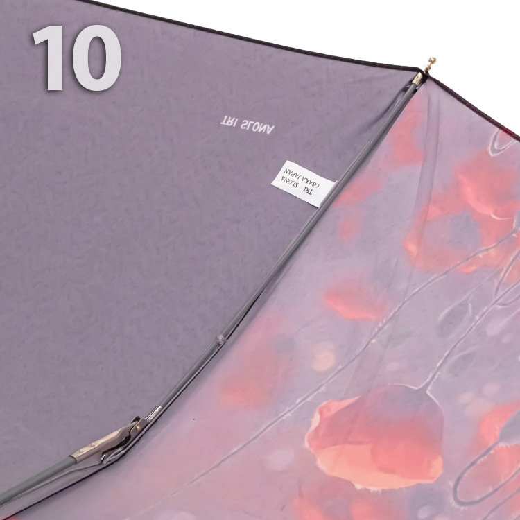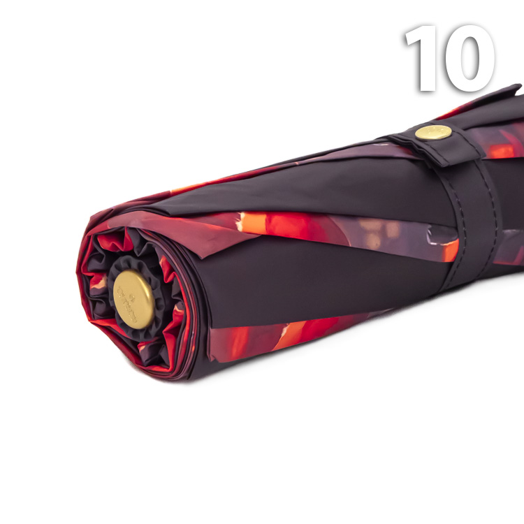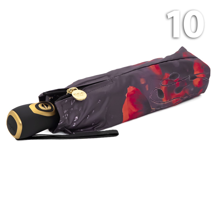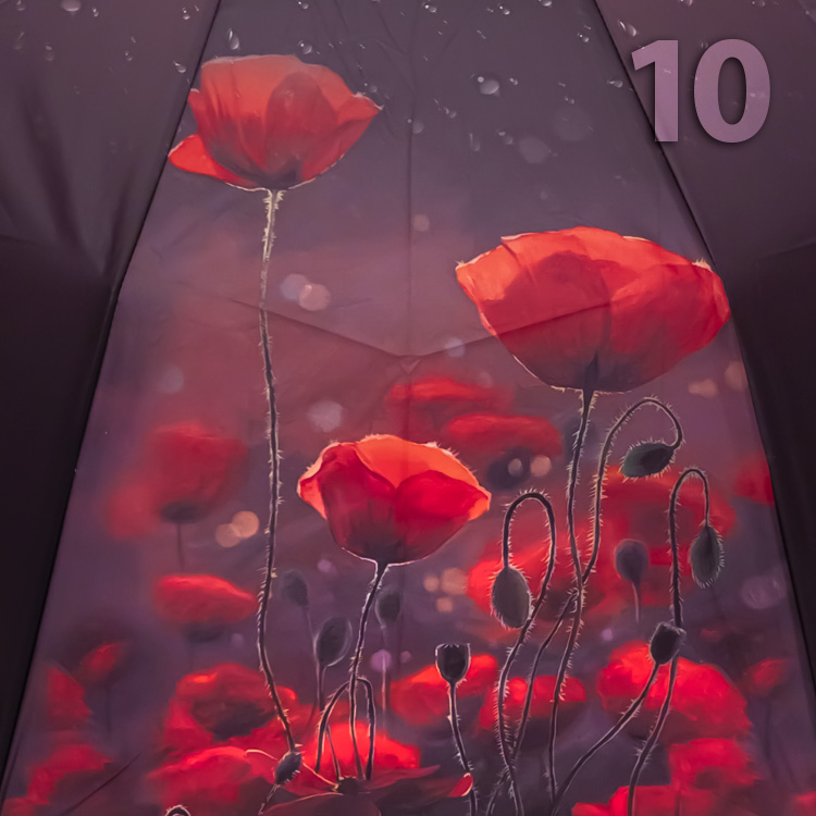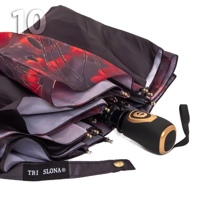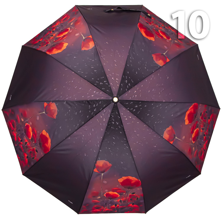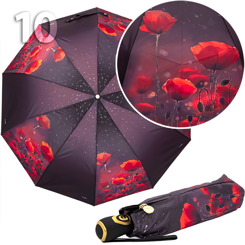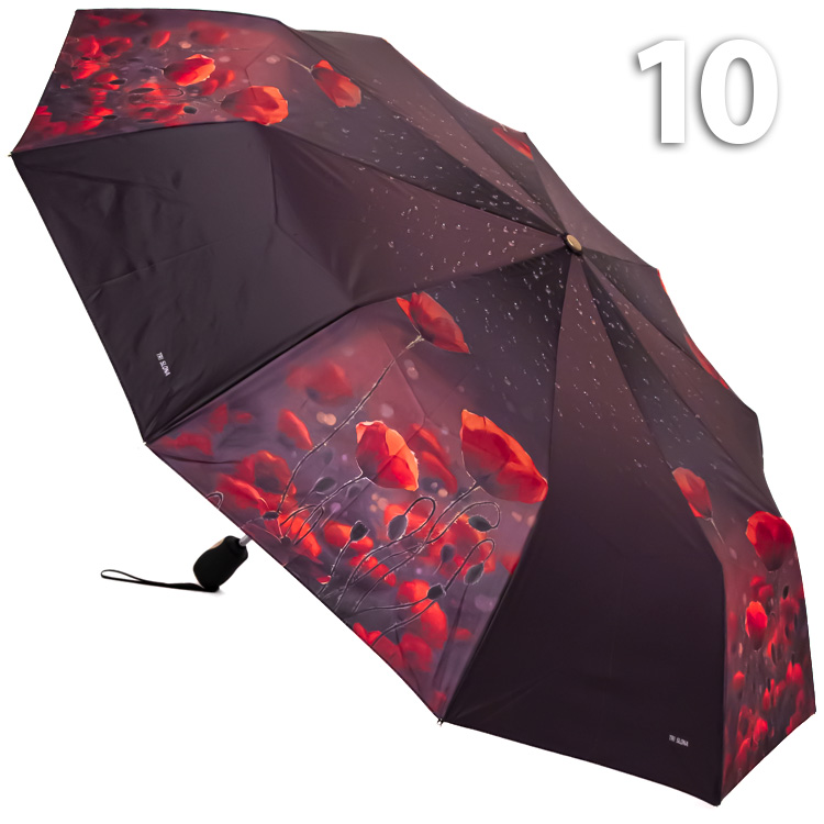 Женский зонт в 3-сложения с чередующимися секторами: один-в коричневых оттенках с переходом от светлого к темному, другой в черных оттенках с изображением красных, хрупких маков в скромном, но ярком обличии представляет компания Три Слона.