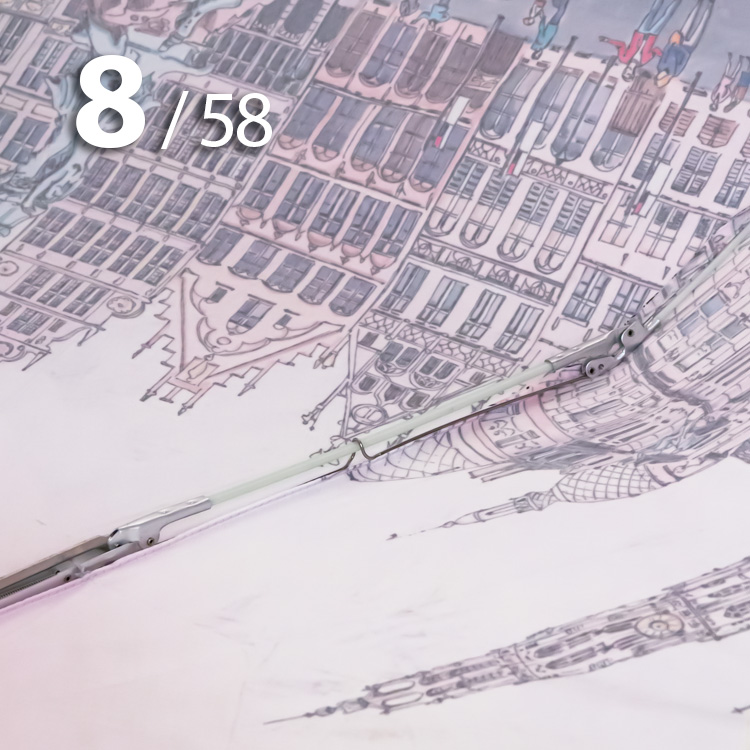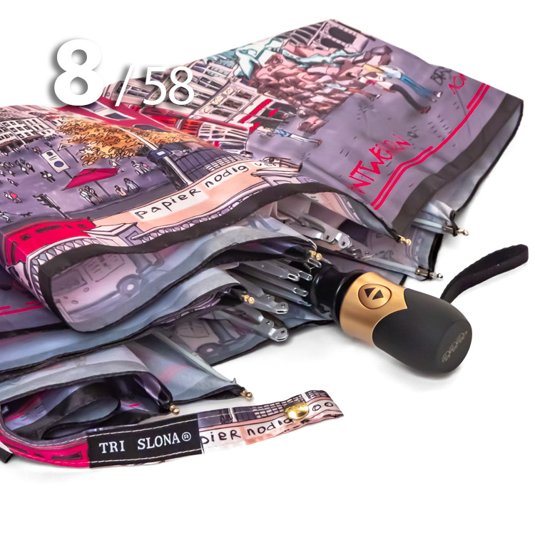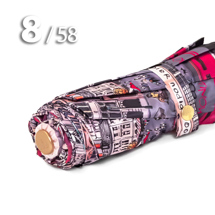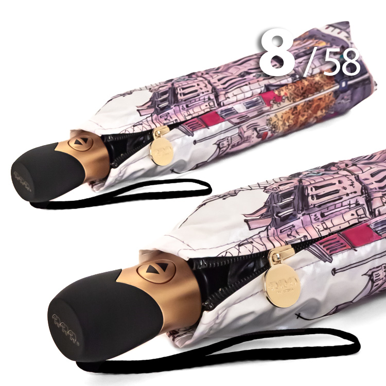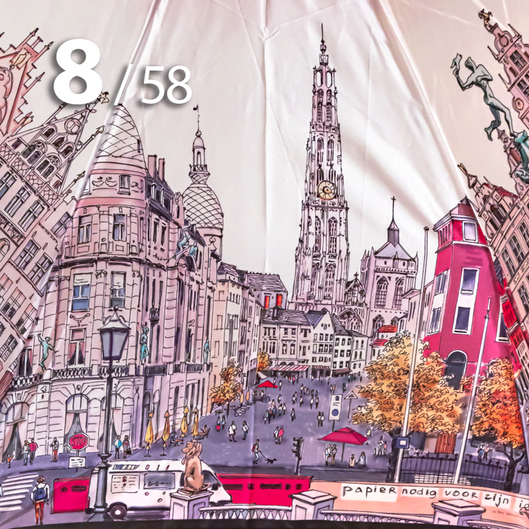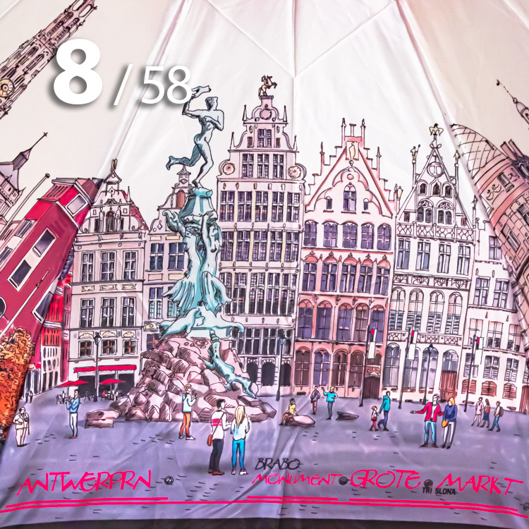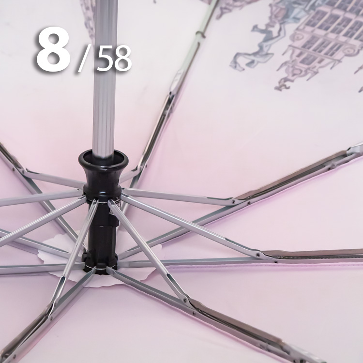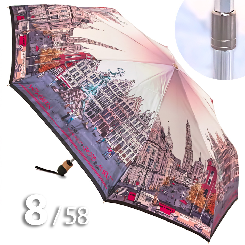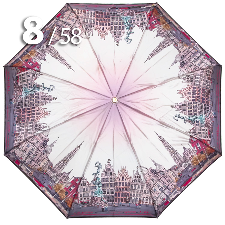 Женский зонт в 3-сложения от компании Три Слона с удивительной панорамой бельгийского города Антверпен на серебристо-розовом куполе притягивает красивыми замками и другими историческими и архитектурными памятниками.