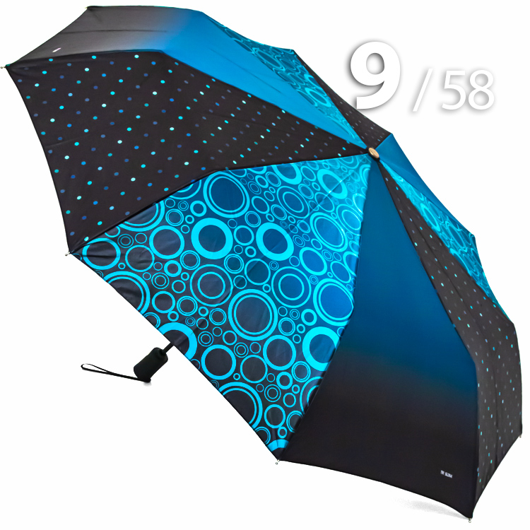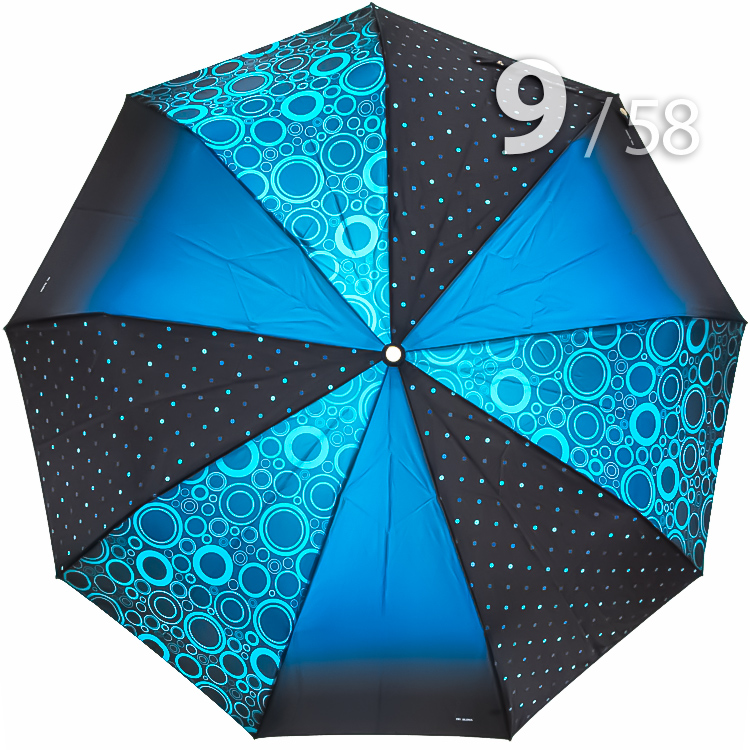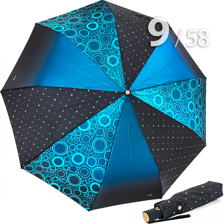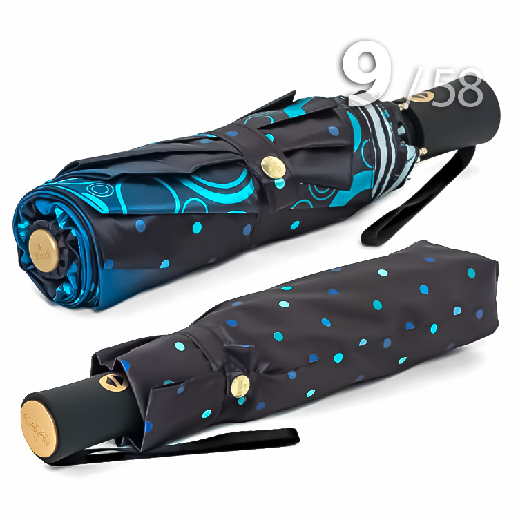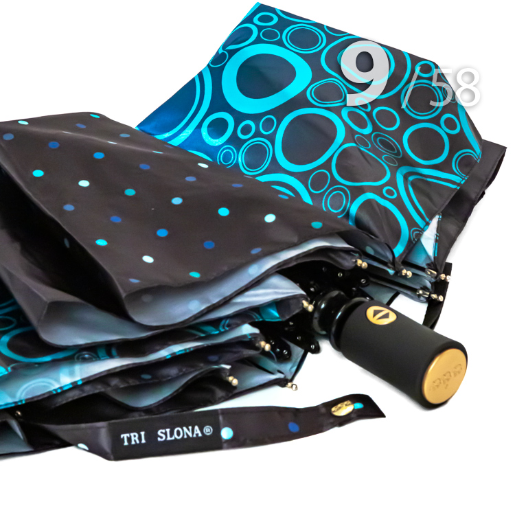 Женский зонт в 3-сложения в черно-синем цвете представляет компания Три Слона. Рисунок в мелкий горох на черном фоне интересно смотрится в сочетании с кругами разного калибра на синем фоне и создают изысканную комбинацию, дополняя друг друга.