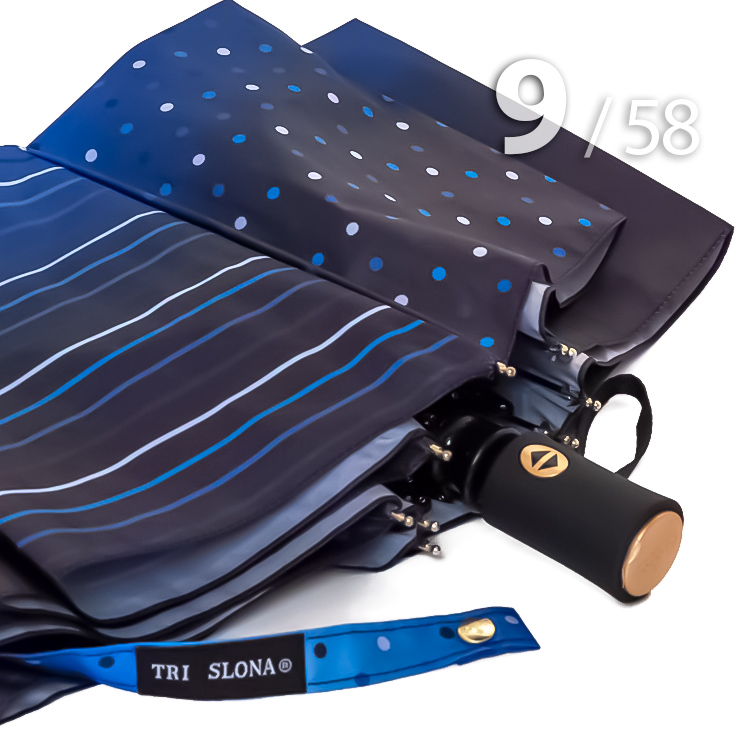 Складной надежный зонт для женщин с ветроустойчивым каркасом 9 спицЖенский зонт от компании Три Слона в 3-сложения с геометрическим принтом - мелкий горох+полоска словно созданы друг для друга и создают по настоящему стильный и интересный образ. Рисунок выполнен в виде градиента - мягкий переход оттенков от голубого, синего к черному выглядит очень необычно.Полный Автомат - гарантирует легкое и комфортное управление, поскольку нажатием всего одной кнопки зонт можно открыть или закрыть.Ткань купола - полиэстер. Тип переплетения нитей «эпонж»- особая структура плетения, способная отталкивать воду. За счет неравномерного распределения нитей, образовываются узелки. Поверхность получается, как бы губчатой, на ней не задерживается влага - стекает вниз.Ручка - удобная выполнена из пластика с прорезиненным покрытием Soft-touch, которое обеспечивает хорошее сцепление с рукой, что уменьшает скольжение ладони и создает удобство при длительном использовании зонта во время дождя. Прорезиненное покрытие повышает стойкость ручки к повреждениям и царапинам. Дополнена ремешком-петелькой для фиксации зонта на запястье или для подвешивания.Каркас - усиленный на 9-ти спицах из высокопрочных материалов, обеспечивает долгий срок службы изделию.Вес: оптимальный для зонта с усиленным каркасом.Чехол – на молнии идет в комплекте, для удобства переноски и хранения, в случае сильно мокрого зонта затруднит протекание и намокание сумки.Антиветер – защищает зонт от поломок. Пружинки в конструкции спиц не дают креплениям ломаться, позволяя им выворачиваться в обратную сторону и возвращаться на место. Но обращаем ваше внимание, что зонт не рекомендуется использовать при порывах ветра (особенно разнонаправленного), так как зонтик может сломаться. И случай не будет являться гарантийным.ДЛЯ КОГОДля тех, кто ценит качество и комфорт. Незаменимая защита на случай затяжных осадков. Прекрасный подарок, который удивит и будет по достоинству оценен в процессе эксплуатации.УХОД И ХРАНЕНИЕПосле использования зонт необходимо просушить. После того как зонт высохнет, сложите купол, аккуратно расправляя складки ткани купола. Затем без усилий стянуть хлястиком и убрать сложенный зонт в чехол. Хранить в сухом месте с плюсовой температурой, не допускать складирования сверху зонта других предметов, способных повредить каркас и купол зонта.Возможные загрязнения отмывайте без усилий, теплым мыльным раствором (использование горячей воды, пятновыводителей и других агрессивных жидкостей не допускается).Только в нашем специализированном розничном магазине зонтов и в сравнении с другими аналогами, вы можете оценить качественное преимущество этого зонта, которое не видно по картинке.
