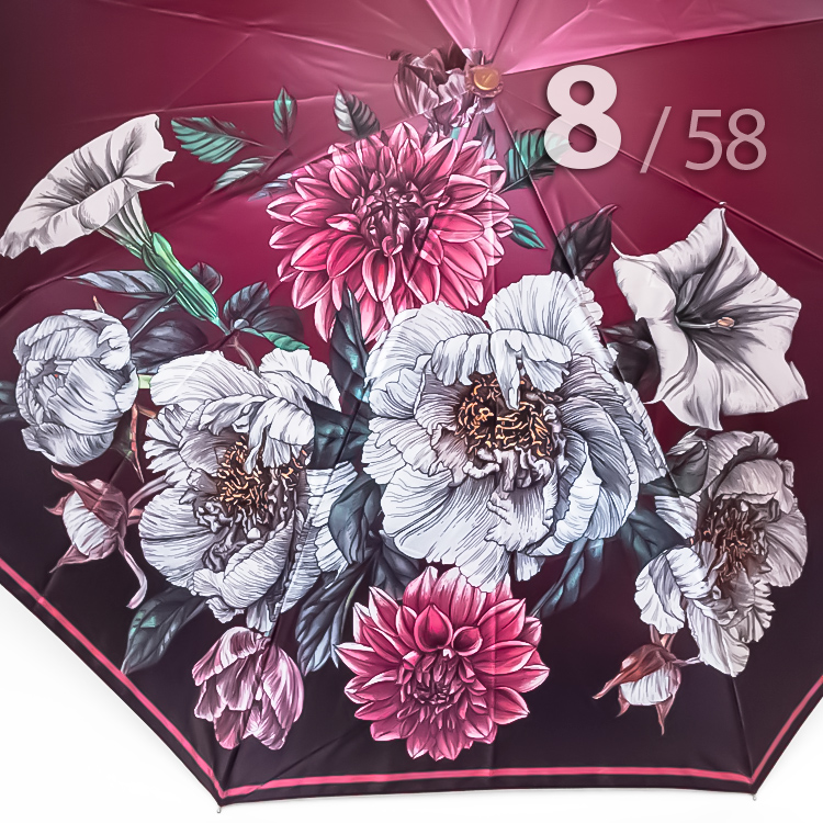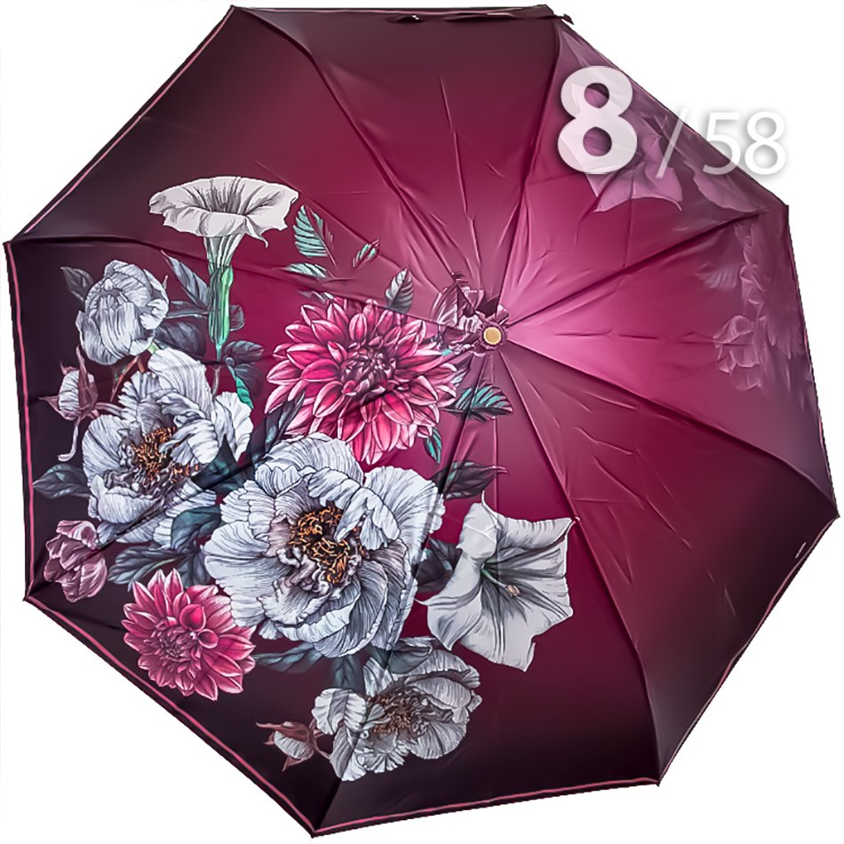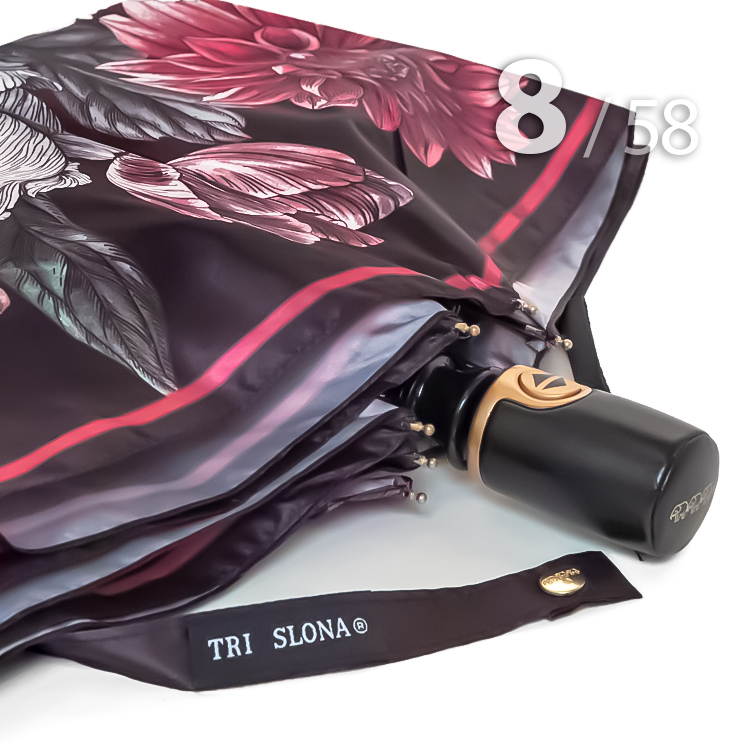 Женский зонт в 3-сложения от компании Три Слона, декорированный панорамным цветочным принтом, не вызывает ничего, кроме восхищения. В зонтике органично сочетаются большие, яркие цветы на розовом фоне. Такой рисунок - это уже классика, которая приобрела немыслимую популярность несколько десятилетий назад и, скорее всего, не утратит завоеванных позиций даже в отдаленном будущем.