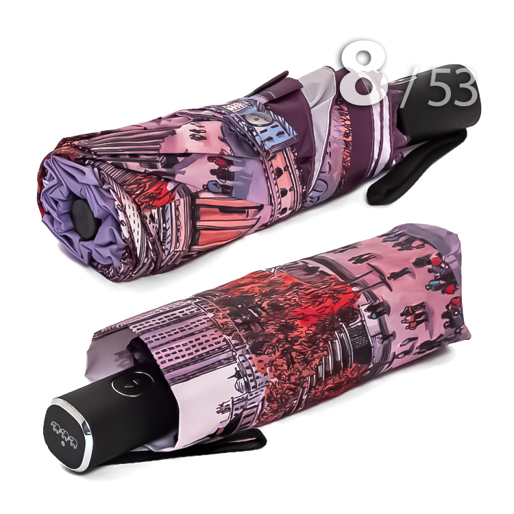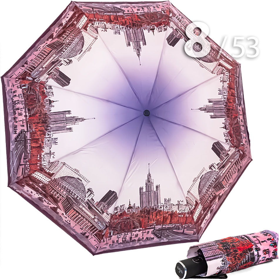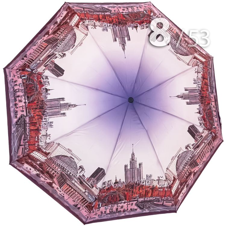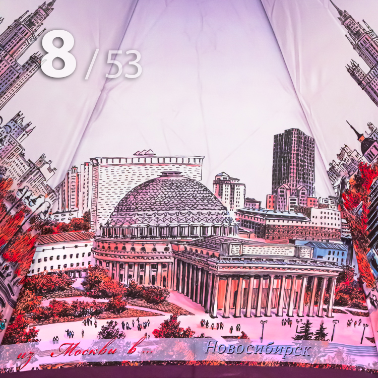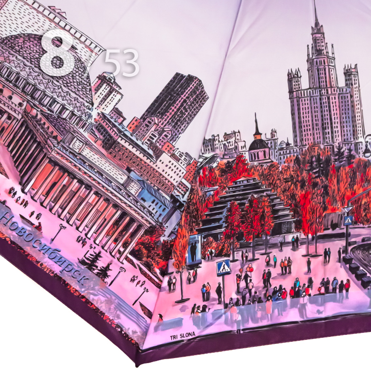 Компактный складной зонт для женщин от компании Три СлонаПутешествия – это очень интересное и захватывающее приключение, в котором человек узнает для себя что-то новое, знакомится с новыми людьми, а также культурой и традициями другого города. Путешествуя по другим городам России, можно посмотреть красивые достопримечательности, архитектуру городов, а также посетить различные музеи, отвлечься от повседневной жизни. Женский облегченный зонт в сиреневых оттенках в 4-сложения от компании Три Слона с чередующимися секторами, на которых изображены достопримечательности Москвы и Новосибирска подарит Вам незабываемые ощущения.Полный Автомат - гарантирует легкое и комфортное управление, поскольку нажатием всего одной кнопки зонт можно открыть или закрыть.Ткань купола - полиэстер со специальной водоотталкивающей пропиткой, которая успешно противостоит воздействию воды, пыли и грязи.Ручка - очень удобная, выполнена из пластика с прорезиненным покрытием Soft-touch, которое обеспечивает хорошее сцепление с рукой, что уменьшает скольжение и создает удобство при длительном использовании ручки во время дождя или при влажных условиях. Прорезиненное покрытие повышает стойкость ручки к повреждениям и царапинам, увеличивая срок службы изделия. Дополнена ремешком-петелькой для фиксации зонта на запястье или для подвешивания..Каркас - на 8-ми спицах из высокопрочных материалов, обеспечивает долгий срок службы изделию.Вес: 330 г - облегченный вес достигается за счет использования очень легких материалов. При этом они отлично показывают себя в характеристиках прочности и надежности.Чехол – на молнии идет в комплекте, для удобства переноски и хранения, в случае сильно мокрого зонта затруднит протекание и намокание сумки.Антиветер – защищает зонт от поломок. Пружинки в конструкции спиц не дают креплениям ломаться, позволяя им выворачиваться в обратную сторону и возвращаться на место. Но обращаем ваше внимание, что зонт не рекомендуется использовать при порывах ветра (особенно разнонаправленного), так как зонтик может сломаться. И случай не будет считаться гарантийным.ДЛЯ КОГОМодель для мобильных, деловых и активных - повседневное использование. Оптимальный размер купола позволяет использовать зонт даже в плотном городском потоке.Учитывая компактность и малый вес, его можно брать с собой в поездку или использовать в качестве варианта "на всякий случай", когда вероятность осадков сомнительна.УХОД И ХРАНЕНИЕПосле использования зонт необходимо просушить. После того как зонт высохнет, сложите купол, аккуратно расправляя складки ткани купола. Затем без усилий стянуть хлястиком и убрать сложенный зонт в чехол. Хранить в сухом месте с плюсовой температурой, не допускать складирования сверху зонта других предметов, способных повредить каркас и купол зонта.Возможные загрязнения отмывайте без усилий, теплым мыльным раствором (использование горячей воды, пятновыводителей и других агрессивных жидкостей не допускается).Только в нашем специализированном розничном магазине зонтов и в сравнении с другими аналогами, вы можете оценить качественное преимущество этого зонта, которое не видно по картинке.