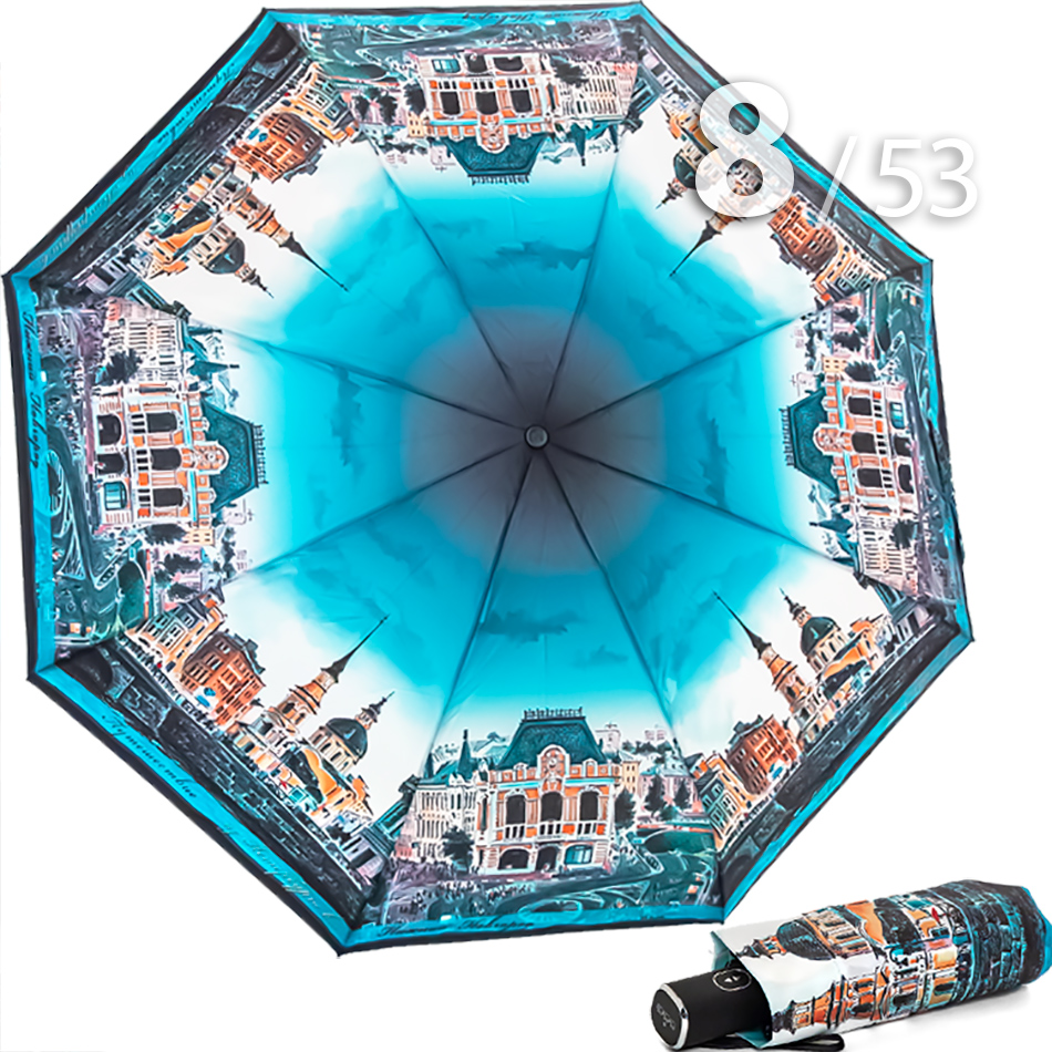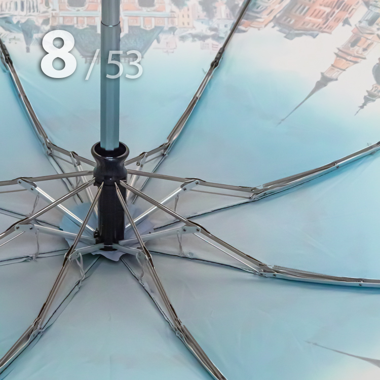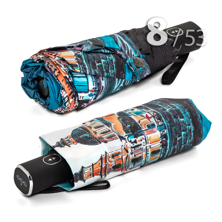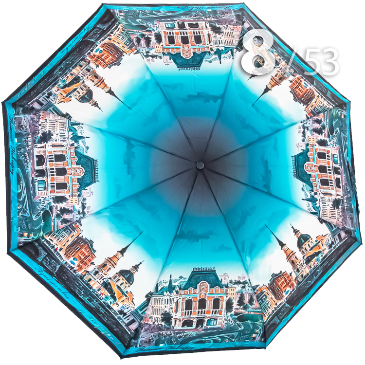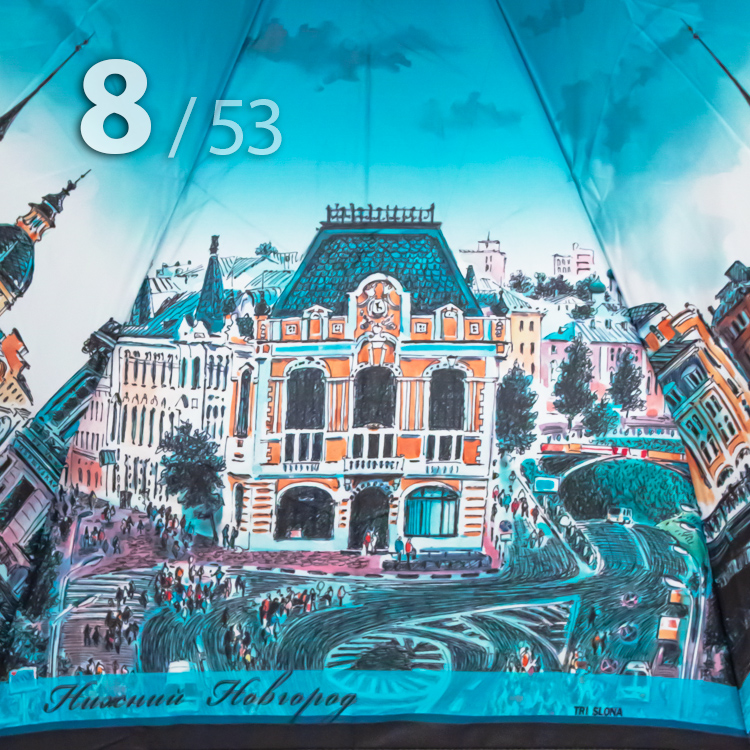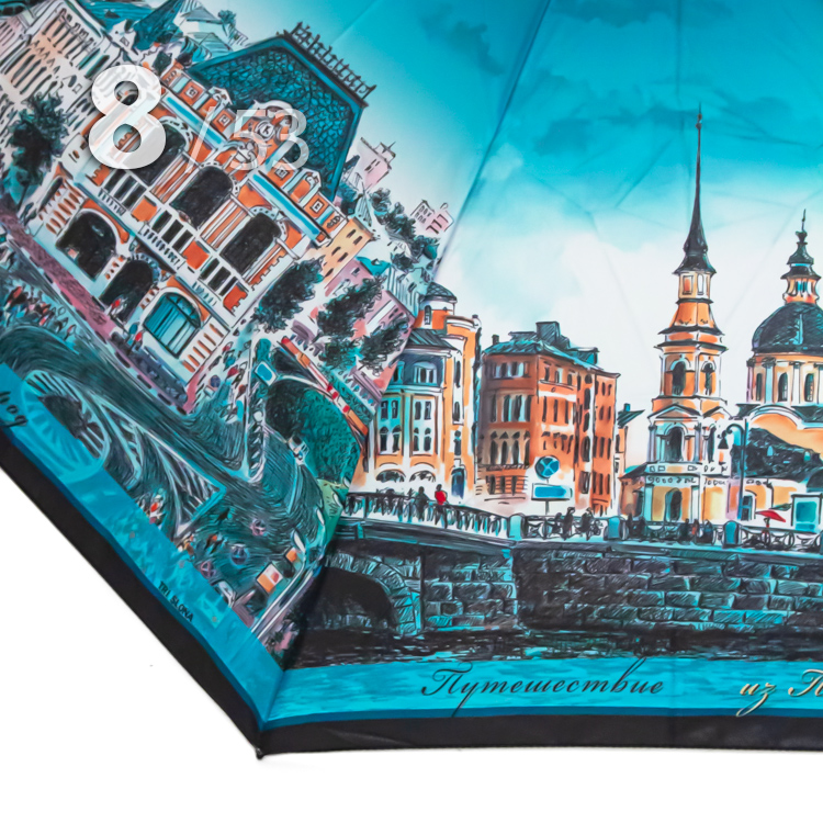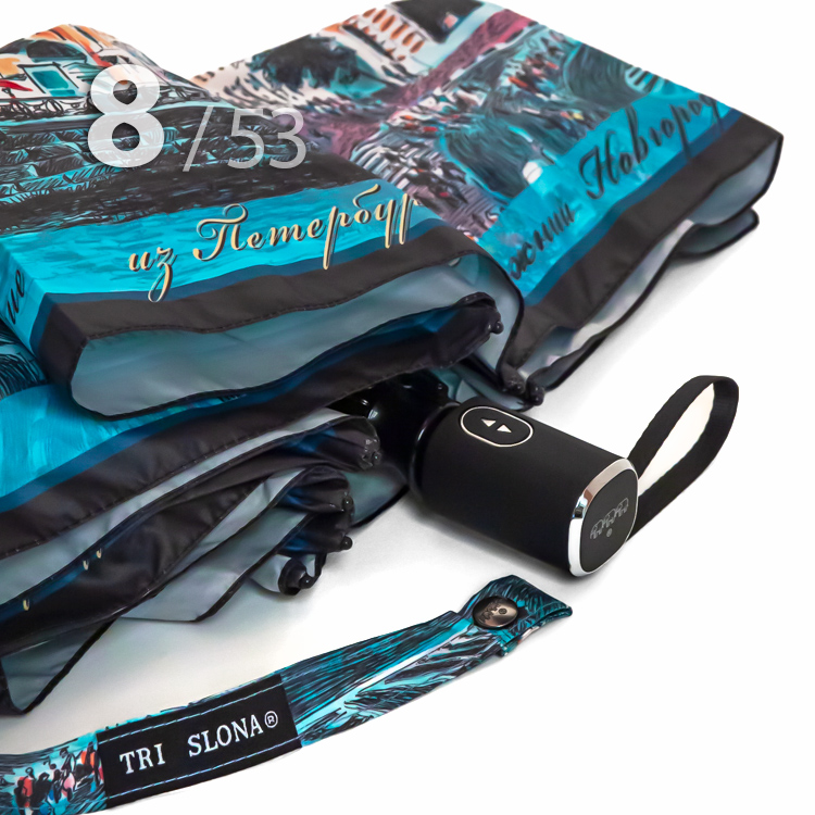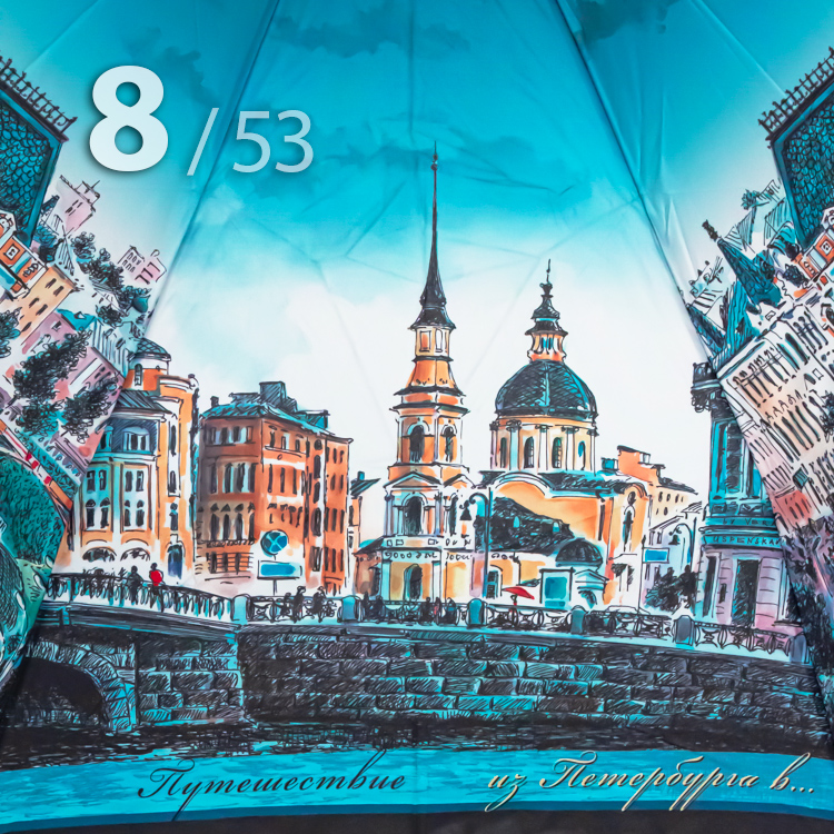 Компактный складной зонт для женщин от компании Три СлонаПутешествия – это очень интересное и захватывающее приключение, в котором человек узнает для себя что-то новое, знакомится с новыми людьми, а также культурой и традициями другого города. Путешествуя по другим городам России, можно посмотреть красивые достопримечательности, архитектуру городов, а также посетить различные музеи, отвлечься от повседневной жизни. Женский облегченный зонт в голубых оттенках в 4-сложения от компании Три Слона с чередующимися секторами, на которых изображены достопримечательности Петербурга и Нижнего Новгорода подарит Вам незабываемые ощущения.Полный Автомат - гарантирует легкое и комфортное управление, поскольку нажатием всего одной кнопки зонт можно открыть или закрыть.Ткань купола - полиэстер со специальной водоотталкивающей пропиткой, которая успешно противостоит воздействию воды, пыли и грязи.Ручка - очень удобная, выполнена из пластика с прорезиненным покрытием Soft-touch, которое обеспечивает хорошее сцепление с рукой, что уменьшает скольжение и создает удобство при длительном использовании ручки во время дождя или при влажных условиях. Прорезиненное покрытие повышает стойкость ручки к повреждениям и царапинам, увеличивая срок службы изделия. Дополнена ремешком-петелькой для фиксации зонта на запястье или для подвешивания..Каркас - на 8-ми спицах из высокопрочных материалов, обеспечивает долгий срок службы изделию.Вес: 330 г - облегченный вес достигается за счет использования очень легких материалов. При этом они отлично показывают себя в характеристиках прочности и надежности.Чехол – на молнии идет в комплекте, для удобства переноски и хранения, в случае сильно мокрого зонта затруднит протекание и намокание сумки.Антиветер – защищает зонт от поломок. Пружинки в конструкции спиц не дают креплениям ломаться, позволяя им выворачиваться в обратную сторону и возвращаться на место. Но обращаем ваше внимание, что зонт не рекомендуется использовать при порывах ветра (особенно разнонаправленного), так как зонтик может сломаться. И случай не будет считаться гарантийным.ДЛЯ КОГОМодель для мобильных, деловых и активных - повседневное использование. Оптимальный размер купола позволяет использовать зонт даже в плотном городском потоке.Учитывая компактность и малый вес, его можно брать с собой в поездку или использовать в качестве варианта "на всякий случай", когда вероятность осадков сомнительна.УХОД И ХРАНЕНИЕПосле использования зонт необходимо просушить. После того как зонт высохнет, сложите купол, аккуратно расправляя складки ткани купола. Затем без усилий стянуть хлястиком и убрать сложенный зонт в чехол. Хранить в сухом месте с плюсовой температурой, не допускать складирования сверху зонта других предметов, способных повредить каркас и купол зонта.Возможные загрязнения отмывайте без усилий, теплым мыльным раствором (использование горячей воды, пятновыводителей и других агрессивных жидкостей не допускается).Только в нашем специализированном розничном магазине зонтов и в сравнении с другими аналогами, вы можете оценить качественное преимущество этого зонта, которое не видно по картинке.