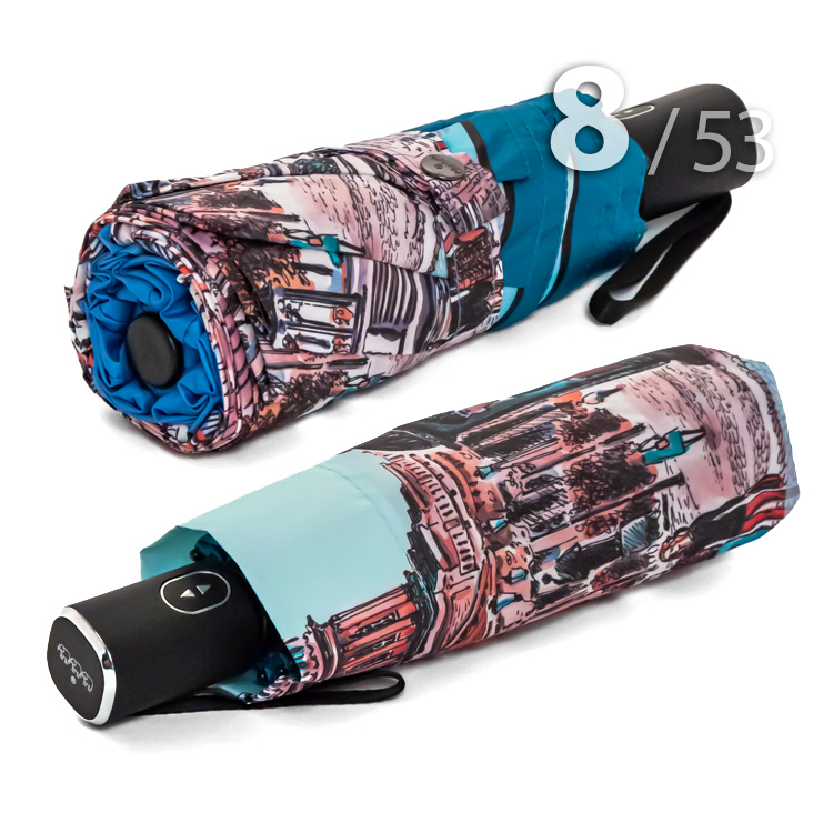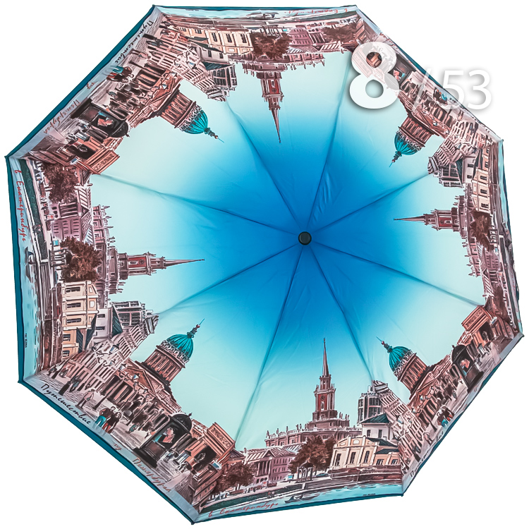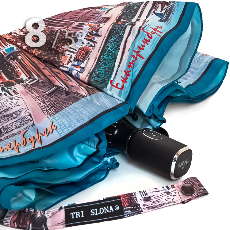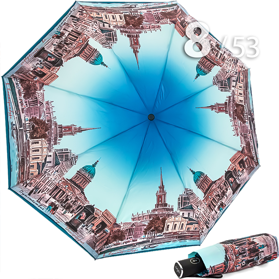 Компактный складной зонт для женщин от компании Три СлонаПутешествия – это очень интересное и захватывающее приключение, в котором человек узнает для себя что-то новое, знакомится с новыми людьми, а также культурой и традициями другого города. Путешествуя по другим городам России, можно посмотреть красивые достопримечательности, архитектуру городов, а также посетить различные музеи, отвлечься от повседневной жизни. Женский облегченный зонт в голубых оттенках в 4-сложения от компании Три Слона с чередующимися секторами, на которых изображены достопримечательности Петербурга и Екатеринбурга подарит Вам незабываемые ощущения.Полный Автомат - гарантирует легкое и комфортное управление, поскольку нажатием всего одной кнопки зонт можно открыть или закрыть.Ткань купола - полиэстер со специальной водоотталкивающей пропиткой, которая успешно противостоит воздействию воды, пыли и грязи.Ручка - очень удобная, выполнена из пластика с прорезиненным покрытием Soft-touch, которое обеспечивает хорошее сцепление с рукой, что уменьшает скольжение и создает удобство при длительном использовании ручки во время дождя или при влажных условиях. Прорезиненное покрытие повышает стойкость ручки к повреждениям и царапинам, увеличивая срок службы изделия. Дополнена ремешком-петелькой для фиксации зонта на запястье или для подвешивания..Каркас - на 8-ми спицах из высокопрочных материалов, обеспечивает долгий срок службы изделию.Вес: 330 г - облегченный вес достигается за счет использования очень легких материалов. При этом они отлично показывают себя в характеристиках прочности и надежности.Чехол – на молнии идет в комплекте, для удобства переноски и хранения, в случае сильно мокрого зонта затруднит протекание и намокание сумки.Антиветер – защищает зонт от поломок. Пружинки в конструкции спиц не дают креплениям ломаться, позволяя им выворачиваться в обратную сторону и возвращаться на место. Но обращаем ваше внимание, что зонт не рекомендуется использовать при порывах ветра (особенно разнонаправленного), так как зонтик может сломаться. И случай не будет считаться гарантийным.ДЛЯ КОГОМодель для мобильных, деловых и активных - повседневное использование. Оптимальный размер купола позволяет использовать зонт даже в плотном городском потоке.Учитывая компактность и малый вес, его можно брать с собой в поездку или использовать в качестве варианта "на всякий случай", когда вероятность осадков сомнительна.УХОД И ХРАНЕНИЕПосле использования зонт необходимо просушить. После того как зонт высохнет, сложите купол, аккуратно расправляя складки ткани купола. Затем без усилий стянуть хлястиком и убрать сложенный зонт в чехол. Хранить в сухом месте с плюсовой температурой, не допускать складирования сверху зонта других предметов, способных повредить каркас и купол зонта.Возможные загрязнения отмывайте без усилий, теплым мыльным раствором (использование горячей воды, пятновыводителей и других агрессивных жидкостей не допускается).Только в нашем специализированном розничном магазине зонтов и в сравнении с другими аналогами, вы можете оценить качественное преимущество этого зонта, которое не видно по картинке.
