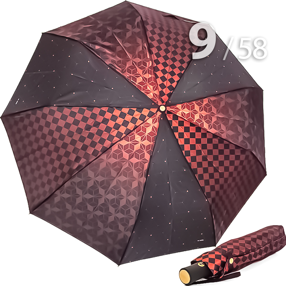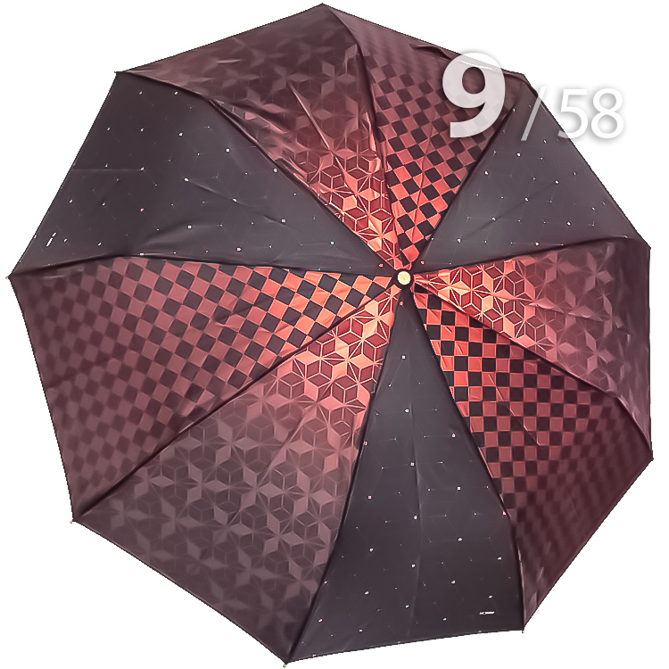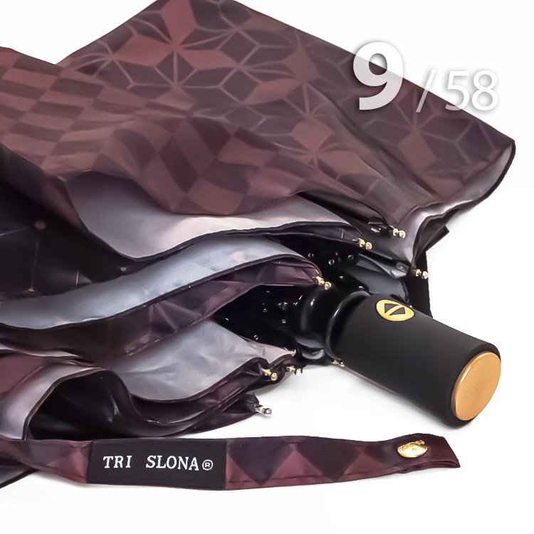 Женский зонт от компании Три Слона в 3-сложения в черно-коричневом цвете с геометрическим принтом, полученным из сочетания различных фигур: ромбов, квадратов, кубов добавляет графичности и строгости образу.