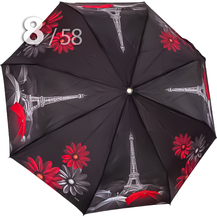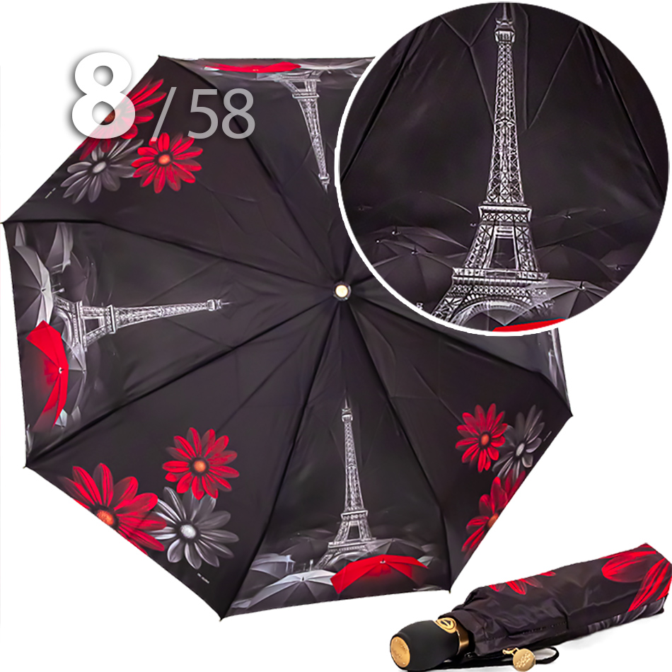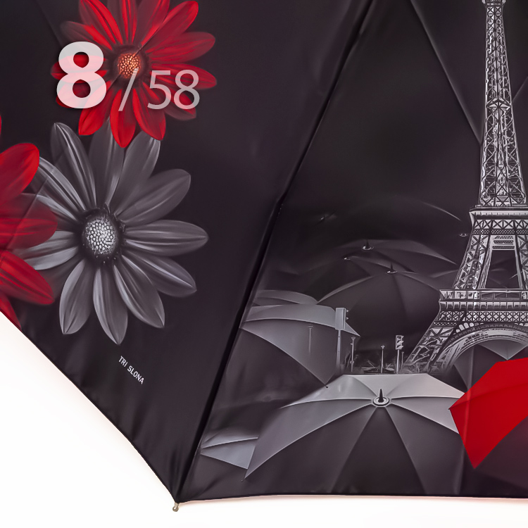 Складной зонт для женщин с сатиновым куполом от компании Три СлонаЖенский зонт в 3-сложения с чередующимися секторами с изображением главным и самым узнаваемым символом Парижа - величественной Эйфелевой башни и шикарных цветов герберов представляет бренд Три Слона. Грамотно подобранное сочетание рисунка в серо-красной гамме на черном фоне смотрится очень перфектно.Полный Автомат - гарантирует легкое и комфортное управление, поскольку нажатием всего одной кнопки зонт можно открыть или закрыть. При полном сложении изделия, купол фиксирует специальный хлястик на металлической кнопке.Ткань купола - полиэстер, обработанный водоотталкивающей пропиткой, которая успешно противостоит воздействию воды, пыли и грязи. Вид полотна-сатин, ткань с особым типом переплетения, когда на лицевой стороне перекрытие нитей удлиненное. Сатин - плотный материал отличается от других материалов благородным блеском, гладкостью и практичностью.Ручка - большая и удобная выполнена из пластика с прорезиненным покрытием Soft-touch, которое обеспечивает хорошее сцепление с рукой, что уменьшает скольжение ладони и создает удобство при длительном использовании зонта во время дождя. Прорезиненное покрытие повышает стойкость ручки к повреждениям и царапинам. Дополнена ремешком-петелькой для фиксации зонта на запястье или для подвешивания.Каркас - усиленный на 8-ми спицах из высокопрочных материалов, обеспечивает долгий срок службы изделию.Чехол – на молнии идет в комплекте, для удобства переноски и хранения, в случае сильно мокрого зонта затруднит протекание и намокание сумки.Антиветер – защищает зонт от поломок. Пружинки в конструкции спиц не дают креплениям ломаться, позволяя им выворачиваться в обратную сторону и возвращаться на место. Обращаем ваше внимание, что зонт не рекомендуется использовать при порывах ветра (особенно разнонаправленного), так как зонтик может сломаться. И случай не будет считаться гарантийным.ДЛЯ КОГОДля тех, кто ценит качество и комфорт. Данный экземпляр придаст Вам особую загадочность. И его владелица останется довольна тем, что гармоничная оригинальность модели придется многим по вкусу.УХОД И ХРАНЕНИЕПосле использования зонт необходимо просушить. После того как зонт высохнет, сложите купол, аккуратно расправляя складки ткани купола. Затем без усилий стянуть хлястиком и убрать сложенный зонт в чехол. Хранить в сухом месте с плюсовой температурой, не допускать складирования сверху зонта других предметов, способных повредить каркас и купол зонта.Возможные загрязнения отмывайте без усилий, теплым мыльным раствором (использование горячей воды, пятновыводителей и других агрессивных жидкостей не допускается).Только в нашем специализированном розничном магазине зонтов и в сравнении с другими аналогами, вы можете оценить качественное преимущество этого зонта, которое не видно по картинке.