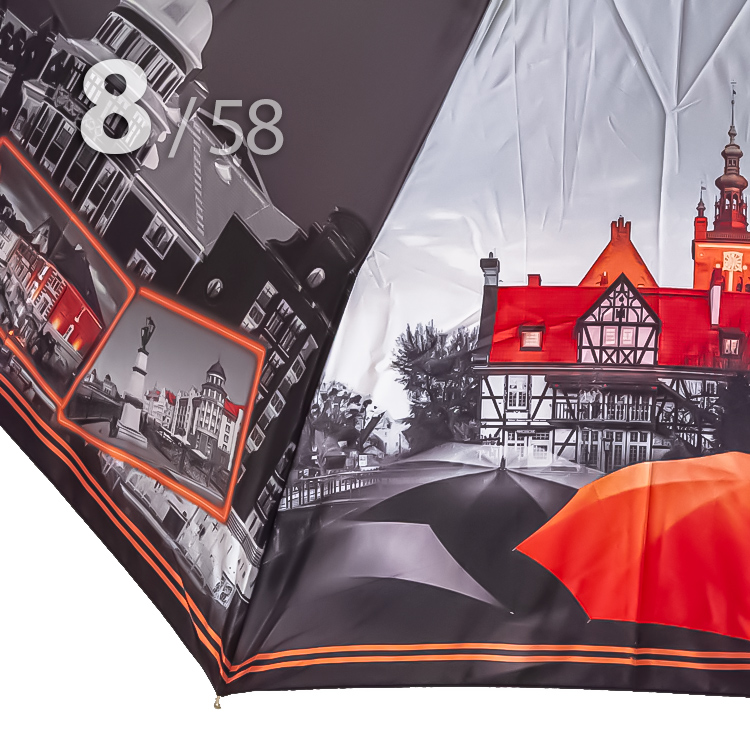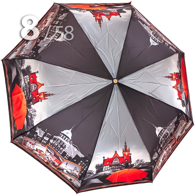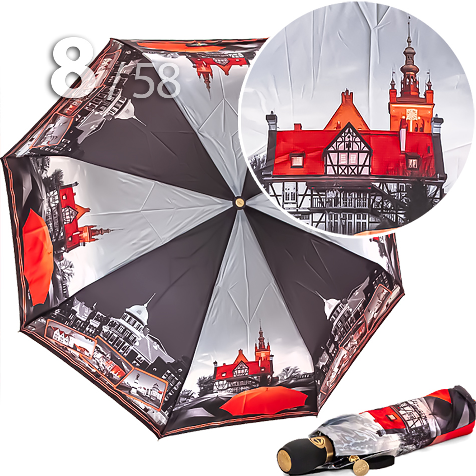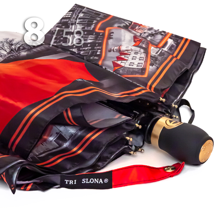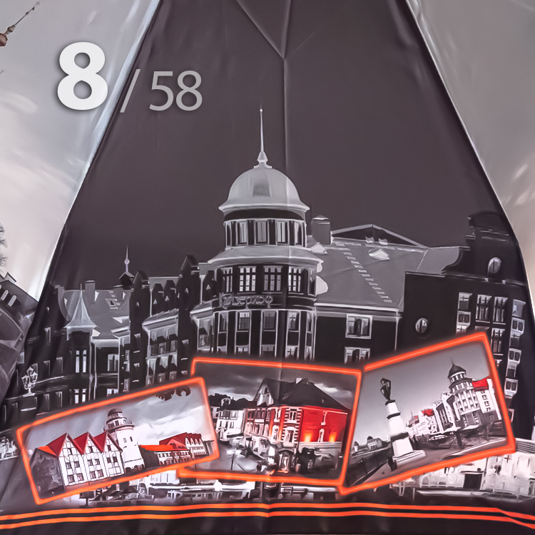 Складной зонт для женщин с сатиновым куполом от компании Три СлонаЖенский зонт в 3-сложения от компании Три Слона с чередующимися секторами в серо-черном, на которых изображены достопримечательности поразительно интересного, благодаря своей контрастности, города - Калиниград. Рисунок в янтарно-оранжевой гамме прочно ассоциируется с Калининградом.Полный Автомат - гарантирует легкое и комфортное управление, поскольку нажатием всего одной кнопки зонт можно открыть или закрыть. При полном сложении изделия, купол фиксирует специальный хлястик на металлической кнопке.Ткань купола - полиэстер, обработанный водоотталкивающей пропиткой, которая успешно противостоит воздействию воды, пыли и грязи. Вид полотна-сатин, ткань с особым типом переплетения, когда на лицевой стороне перекрытие нитей удлиненное. Сатин - плотный материал отличается от других материалов благородным блеском, гладкостью и практичностью.Ручка - большая и удобная выполнена из пластика с прорезиненным покрытием Soft-touch, которое обеспечивает хорошее сцепление с рукой, что уменьшает скольжение ладони и создает удобство при длительном использовании зонта во время дождя. Прорезиненное покрытие повышает стойкость ручки к повреждениям и царапинам. Дополнена ремешком-петелькой для фиксации зонта на запястье или для подвешивания.Каркас - усиленный на 8-ми спицах из высокопрочных материалов, обеспечивает долгий срок службы изделию.Чехол – на молнии идет в комплекте, для удобства переноски и хранения, в случае сильно мокрого зонта затруднит протекание и намокание сумки.Антиветер – защищает зонт от поломок. Пружинки в конструкции спиц не дают креплениям ломаться, позволяя им выворачиваться в обратную сторону и возвращаться на место. Обращаем ваше внимание, что зонт не рекомендуется использовать при порывах ветра (особенно разнонаправленного), так как зонтик может сломаться. И случай не будет считаться гарантийным.ДЛЯ КОГОДля тех, кто ценит качество и комфорт. Рекомендуем подарить как памятный сувенир на память о поездке в Калининград, также подойдет для личного пользования в сезон осадков. Данный экземпляр придаст Вам особую загадочность. И его владелица останется довольна тем, что гармоничная оригинальность модели придется многим по вкусу.УХОД И ХРАНЕНИЕПосле использования зонт необходимо просушить. После того как зонт высохнет, сложите купол, аккуратно расправляя складки ткани купола. Затем без усилий стянуть хлястиком и убрать сложенный зонт в чехол. Хранить в сухом месте с плюсовой температурой, не допускать складирования сверху зонта других предметов, способных повредить каркас и купол зонта.Возможные загрязнения отмывайте без усилий, теплым мыльным раствором (использование горячей воды, пятновыводителей и других агрессивных жидкостей не допускается).Только в нашем специализированном розничном магазине зонтов и в сравнении с другими аналогами, вы можете оценить качественное преимущество этого зонта, которое не видно по картинке.