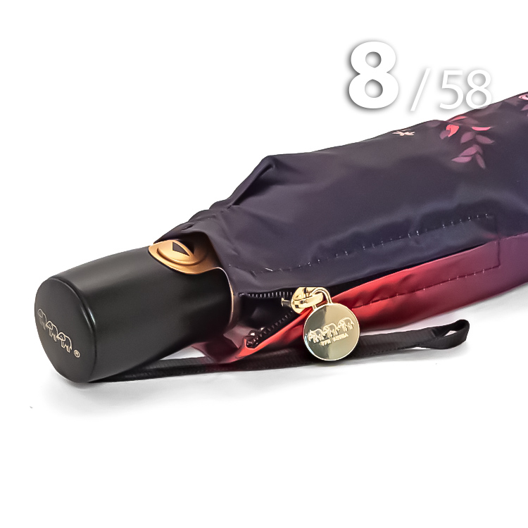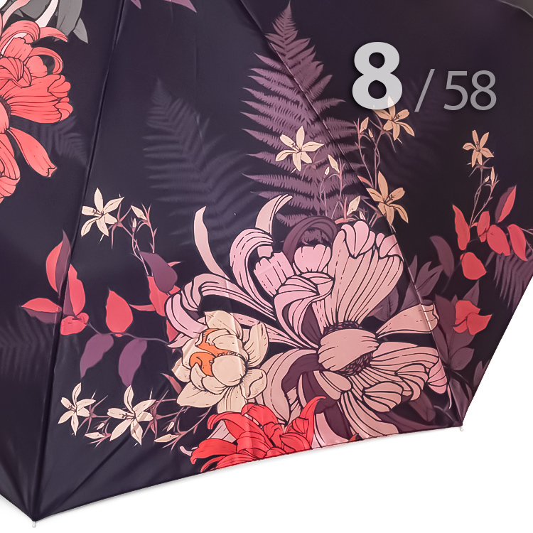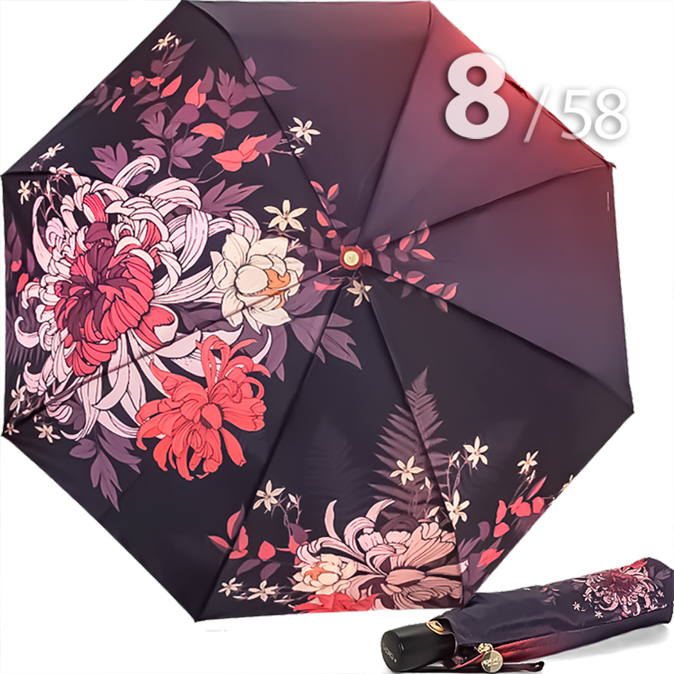 Женский зонт с увеличенным в диаметре куполом, в 3-сложения от компании Три Слона, декорированный панорамным цветочным принтом, не вызывает ничего, кроме восхищения. В зонтике органично сочетаются крупные цветы в красных, розовых, бежевых и фиолетовых оттенках на черно-красном фоне. Такой рисунок - это уже классика, которая приобрела немыслимую популярность несколько десятилетий назад и, скорее всего, не утратит завоеванных позиций даже в отдаленном будущем.