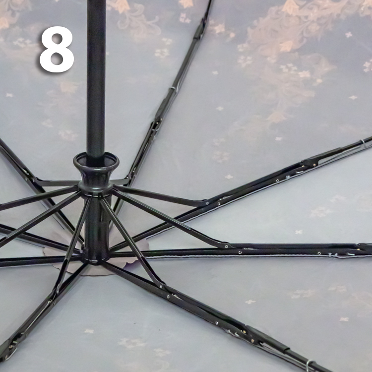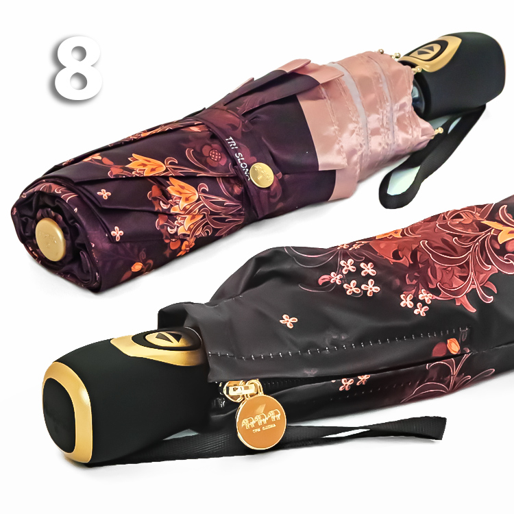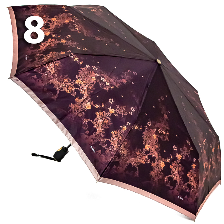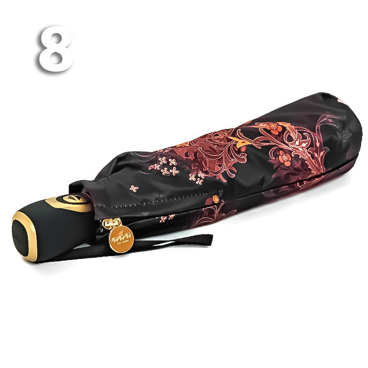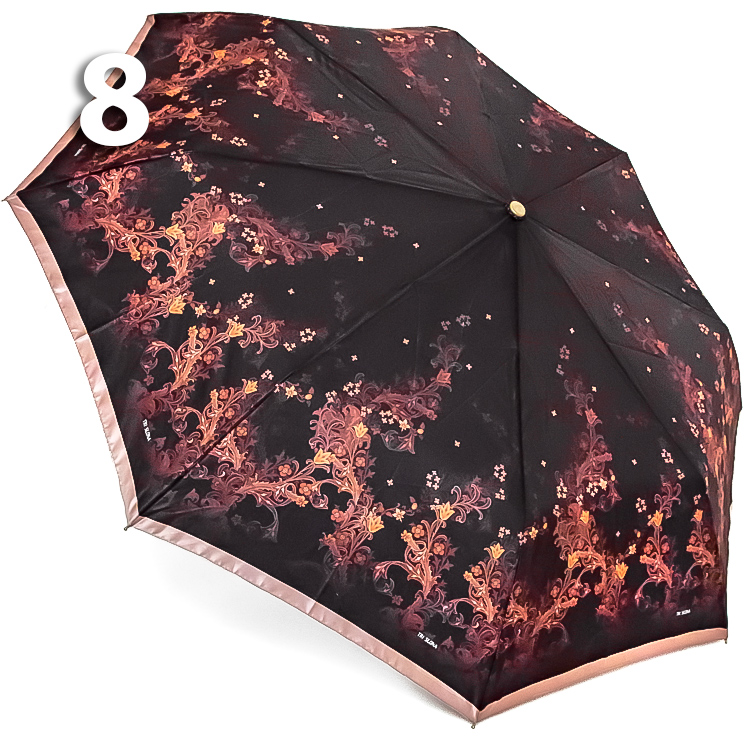 Женский зонт в 3-сложения в черном цвете с удивительным изящным орнаментом по краю купола, который напоминает подсвеченный янтарь, представляет компания Три Слона. представляет компания Три Слона.