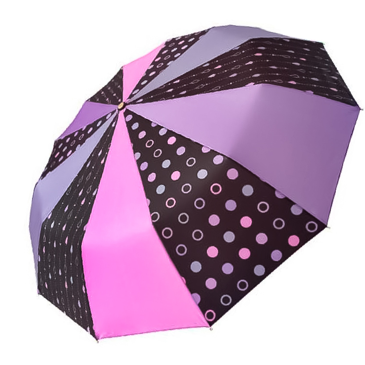 Женский зонт от компании Три Слона с увеличенным в диаметре куполом, в 3-сложения с чередующимися секторами: одни-однотонные сиреневого, розового и фиолетового цвета, другие в черном цвете с задорным и жизнерадостным принтом в разноцветный горох и в виде каплей, соединенных между собой пунктиром. Данная модель добавит немного экстравагантности в ваш образ, но при этом не будет выглядеть вызывающе.