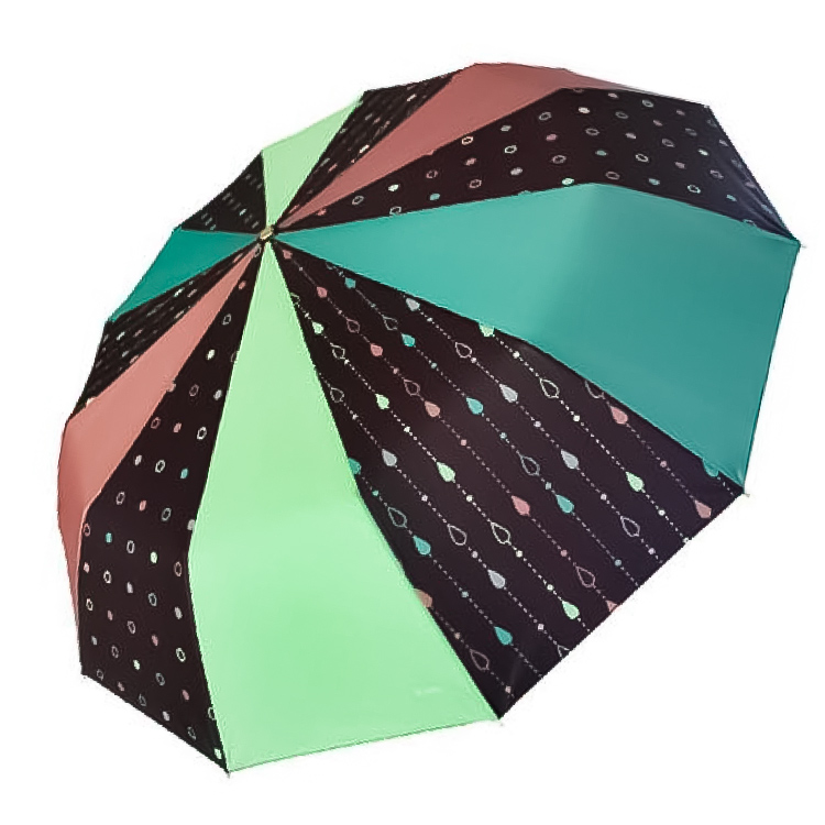 Женский зонт от компании Три Слона с увеличенным в диаметре куполом, в 3-сложения с чередующимися секторами: одни-однотонные зеленого, салатового и светло-коричневого цвета, другие в черном цвете с задорным и жизнерадостным принтом в разноцветный горох и в виде каплей, соединенных между собой пунктиром. Данная модель добавит немного экстравагантности в ваш образ, но при этом не будет выглядеть вызывающе.