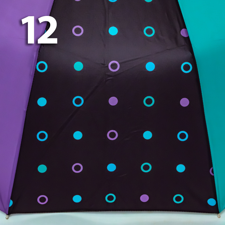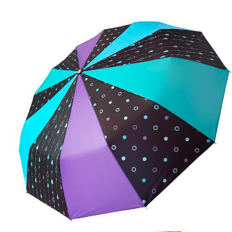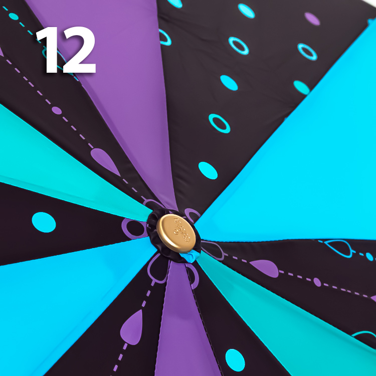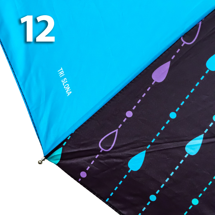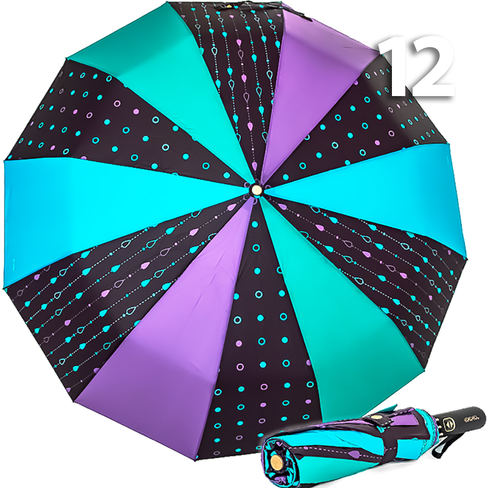 Женский зонт от компании Три Слона с увеличенным в диаметре куполом, в 3-сложения с чередующимися секторами: одни-однотонные голубого, фиолетового и мятного цвета, другие в черном цвете с задорным и жизнерадостным принтом в разноцветный горох и в виде каплей, соединенных между собой пунктиром. Данная модель добавит немного экстравагантности в ваш образ, но при этом не будет выглядеть вызывающе.