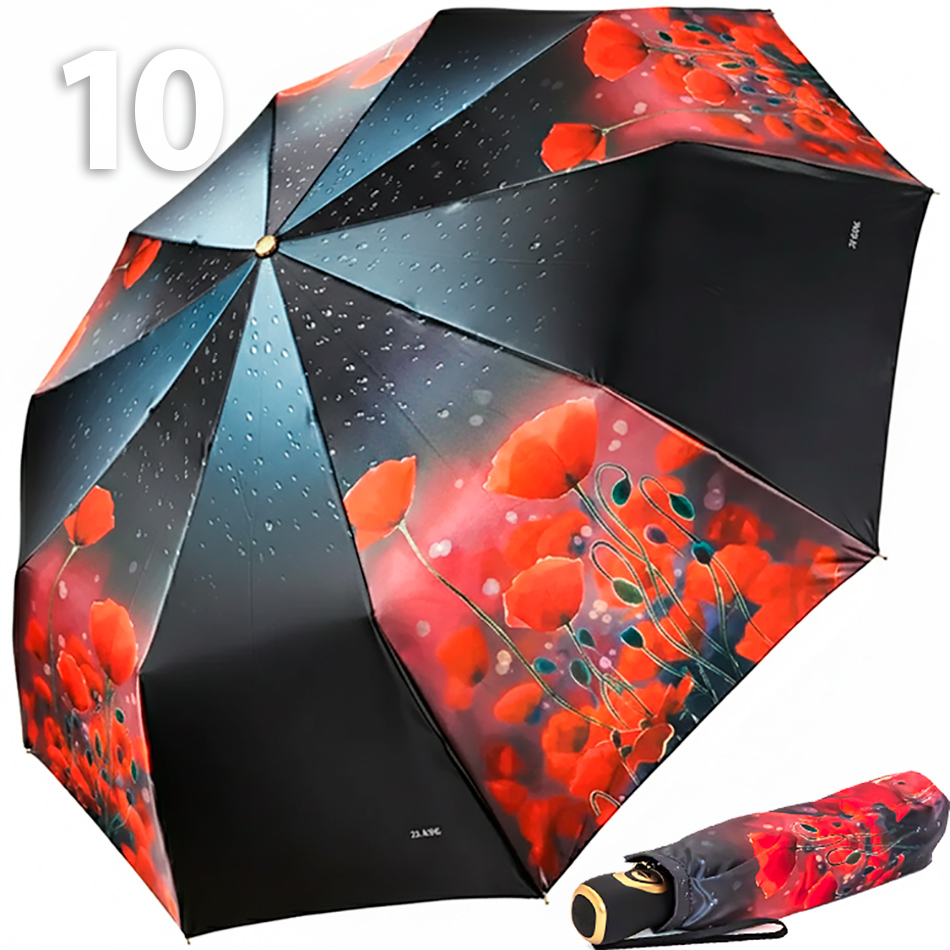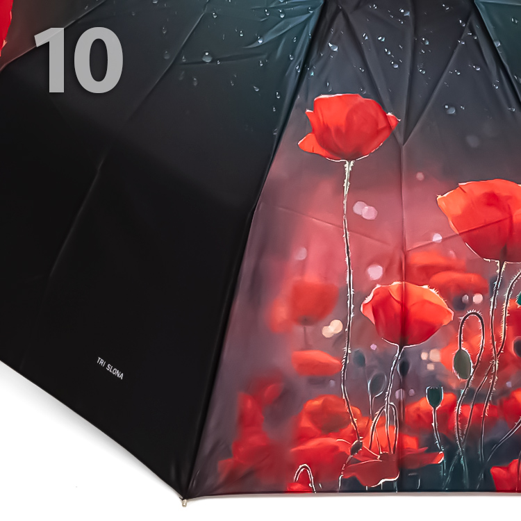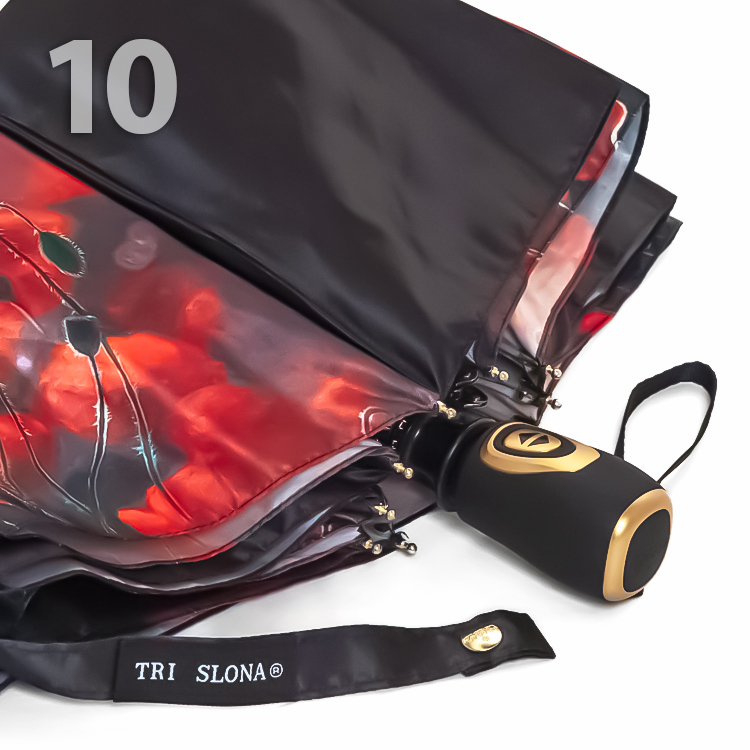 Зонт Три Слона Маки (сатин) 10 спиц, усиленный каркасОригинальный складной женский зонтик в 3-сложения от компании Три Слона, с чередующимися секторами: один - плавный переход тонов от темного чёрного к более светлому оттенку черного, другой сектор с принтом маков на чёрном фоне.Полный Автомат - гарантирует легкое и комфортное управление, поскольку нажатием всего одной кнопки можно открыть или закрыть купол зонта. При полном сложении изделия, купол фиксирует специальный хлястик на металлической кнопке.Материал ткани (купола) - полиэстер с водоотталкивающей пропиткой.Ткань (купола) – Сатин, плотная гладкая ткань, с благородным мягким блеском. Изготавливается особым типом переплетения (сатиновым, когда внешняя поверхность полотна гладкая и блестящая, а на внутренняя сторона полотна — матовая без рисунка, и немного шероховатая.Ручка - большая и удобная выполнена из пластика с прорезиненным покрытием Soft-touch. Прорезиненное покрытие повышает стойкость ручки к повреждениям и царапинам. Дополнена ремешком-петелькой для фиксации зонта на запястье или для подвешивания.Каркас - усиленный на 10-ти спицах из высокопрочных материалов, обеспечивает долгий срок службы изделию.Чехол – на молнии в тон купола (идет в комплекте), для удобства переноски и хранения. В случае сильно мокрого зонта затруднит протекание и намокание сумки.Антиветер – защищает зонт от поломок при выворачивании. Пружинки в конструкции спиц не дают креплениям ломаться, позволяя им выворачиваться в обратную сторону и возвращаться на место. Но обращаем ваше внимание, что зонт не рекомендуется использовать при порывах ветра (особенно разнонаправленного), так как зонтик может сломаться. И случай не будет считаться гарантийным.ДЛЯ КОГОДля тех, кто ценит качество и комфорт. Незаменимая защита на случай затяжных осадков.УХОД И ХРАНЕНИЕПосле использования зонт необходимо просушить. После того как зонт высохнет, сложите купол, аккуратно расправляя складки ткани купола. Затем без усилий стянуть хлястиком и убрать сложенный зонт в чехол. Хранить в сухом месте с плюсовой температурой, не допускать складирования сверху зонта других предметов, способных повредить каркас и купол зонта.Возможные загрязнения отмывайте без усилий, теплым мыльным раствором (использование горячей воды, пятновыводителей и других агрессивных жидкостей не допускается).Только в нашем специализированном розничном магазине зонтов и в сравнении с другими аналогами, вы можете оценить качественное преимущество этого зонта, которое не видно по картинке.