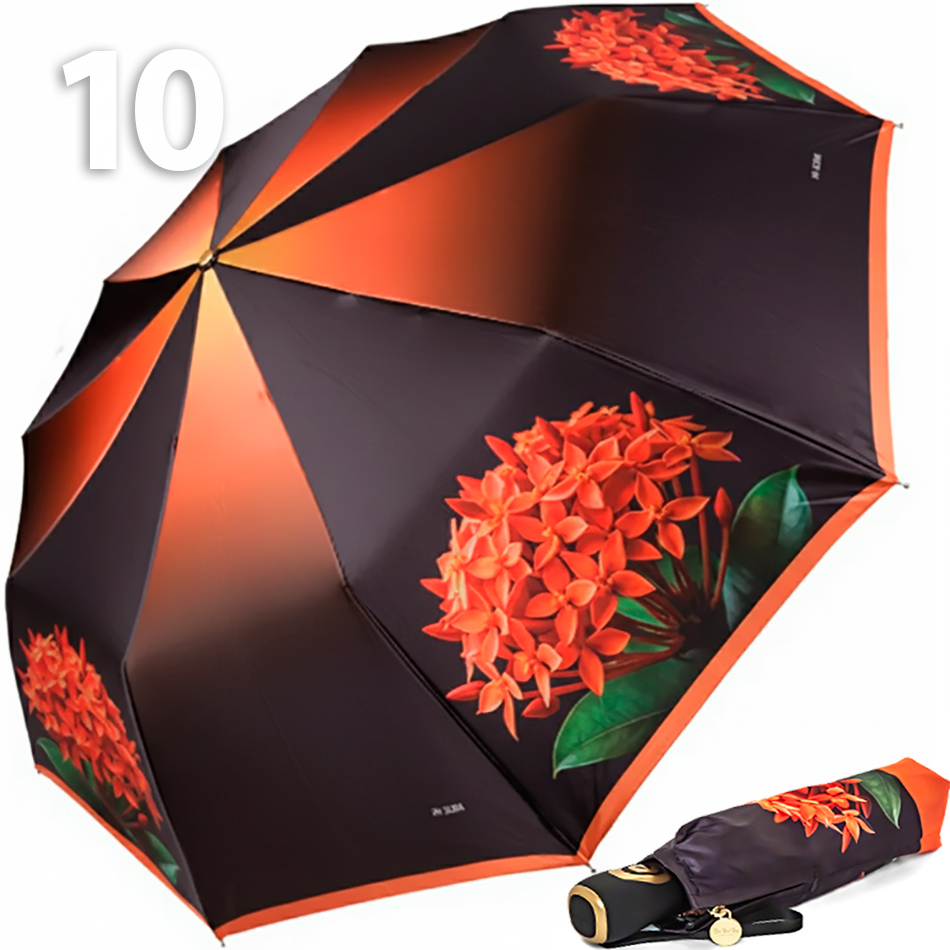 Зонт Три Слона Хойя (сатин) 10 спиц, усиленный каркасОригинальный складной женский зонтик в 3-сложения от компании Три Слона, с чередующимися секторами: один — с плавным переходом от чёрного к оранжевому и жёлтому, другой — в чёрном цвете с рисунком крупного экзотического цветка хойи.Полный Автомат - гарантирует легкое и комфортное управление, поскольку нажатием всего одной кнопки можно открыть или закрыть купол зонта. При полном сложении изделия, купол фиксирует специальный хлястик на металлической кнопке.Материал ткани (купола) - полиэстер с водоотталкивающей пропиткой.Ткань (купола) – Сатин, плотная гладкая ткань, с благородным мягким блеском. Изготавливается особым типом переплетения (сатиновым, когда внешняя поверхность полотна гладкая и блестящая, а на внутренняя сторона полотна — матовая без рисунка, и немного шероховатая.Ручка - большая и удобная выполнена из пластика с прорезиненным покрытием Soft-touch. Прорезиненное покрытие повышает стойкость ручки к повреждениям и царапинам. Дополнена ремешком-петелькой для фиксации зонта на запястье или для подвешивания.Каркас - усиленный на 10-ти спицах из высокопрочных материалов, обеспечивает долгий срок службы изделию.Чехол – на молнии в тон купола (идет в комплекте), для удобства переноски и хранения. В случае сильно мокрого зонта затруднит протекание и намокание сумки.Антиветер – защищает зонт от поломок при выворачивании. Пружинки в конструкции спиц не дают креплениям ломаться, позволяя им выворачиваться в обратную сторону и возвращаться на место. Но обращаем ваше внимание, что зонт не рекомендуется использовать при порывах ветра (особенно разнонаправленного), так как зонтик может сломаться. И случай не будет считаться гарантийным.ДЛЯ КОГОДля тех, кто ценит качество и комфорт. Незаменимая защита на случай затяжных осадков.УХОД И ХРАНЕНИЕПосле использования зонт необходимо просушить. После того как зонт высохнет, сложите купол, аккуратно расправляя складки ткани купола. Затем без усилий стянуть хлястиком и убрать сложенный зонт в чехол. Хранить в сухом месте с плюсовой температурой, не допускать складирования сверху зонта других предметов, способных повредить каркас и купол зонта.Возможные загрязнения отмывайте без усилий, теплым мыльным раствором (использование горячей воды, пятновыводителей и других агрессивных жидкостей не допускается).Только в нашем специализированном розничном магазине зонтов и в сравнении с другими аналогами, вы можете оценить качественное преимущество этого зонта, которое не видно по картинке.
