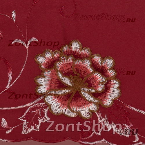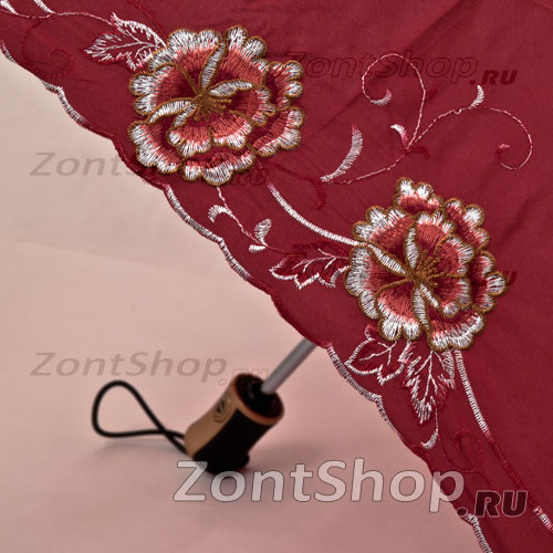 Красивый зонтик полный автомат с бордовым куполом и шикарной вышивкой в виде цветка вдоль него. Эта модель с вместительным куполом, прочной конструкцией каркаса и удобной ручкой не оставит равнодушными дам.